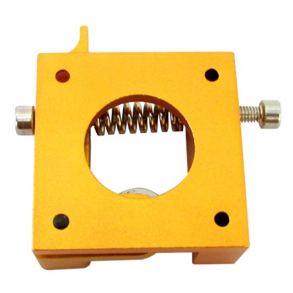 A cabeça de extrusão MK08 possui encaixe direto para motor de passo padrão Nema 17, e sistema de regulagem com mola do filamento sobre o sistema de tração. Esse sistema permite que uma mola mantenha o conjunto de tração sempre com uma pressão constante sem patinar o filamento.