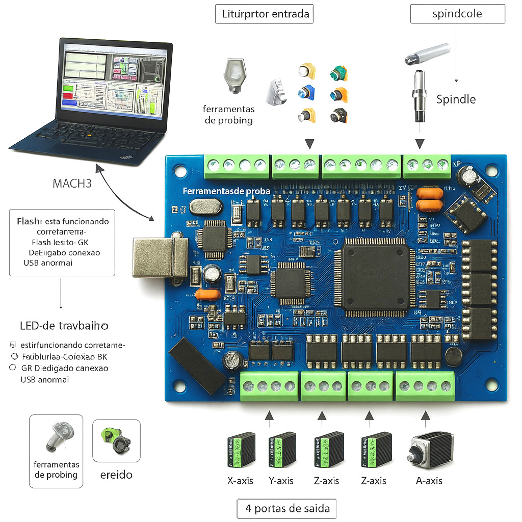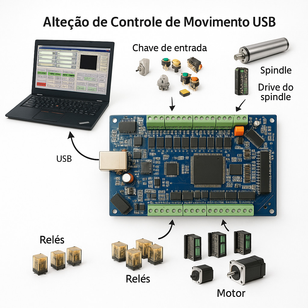 Interface Placa Controladora Opto-Isolada entre PC e máquina CNC, com transmissão de dados via porta USB.